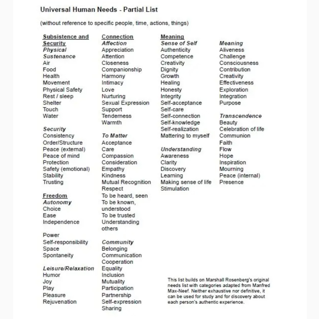 Needs are not:“Text me every hour,”“Never talk to other people,”“Always agree with me.” Those are strategies, demands, and control attempts. Needs are the basic things humans require to feel safe, connected and respected.
